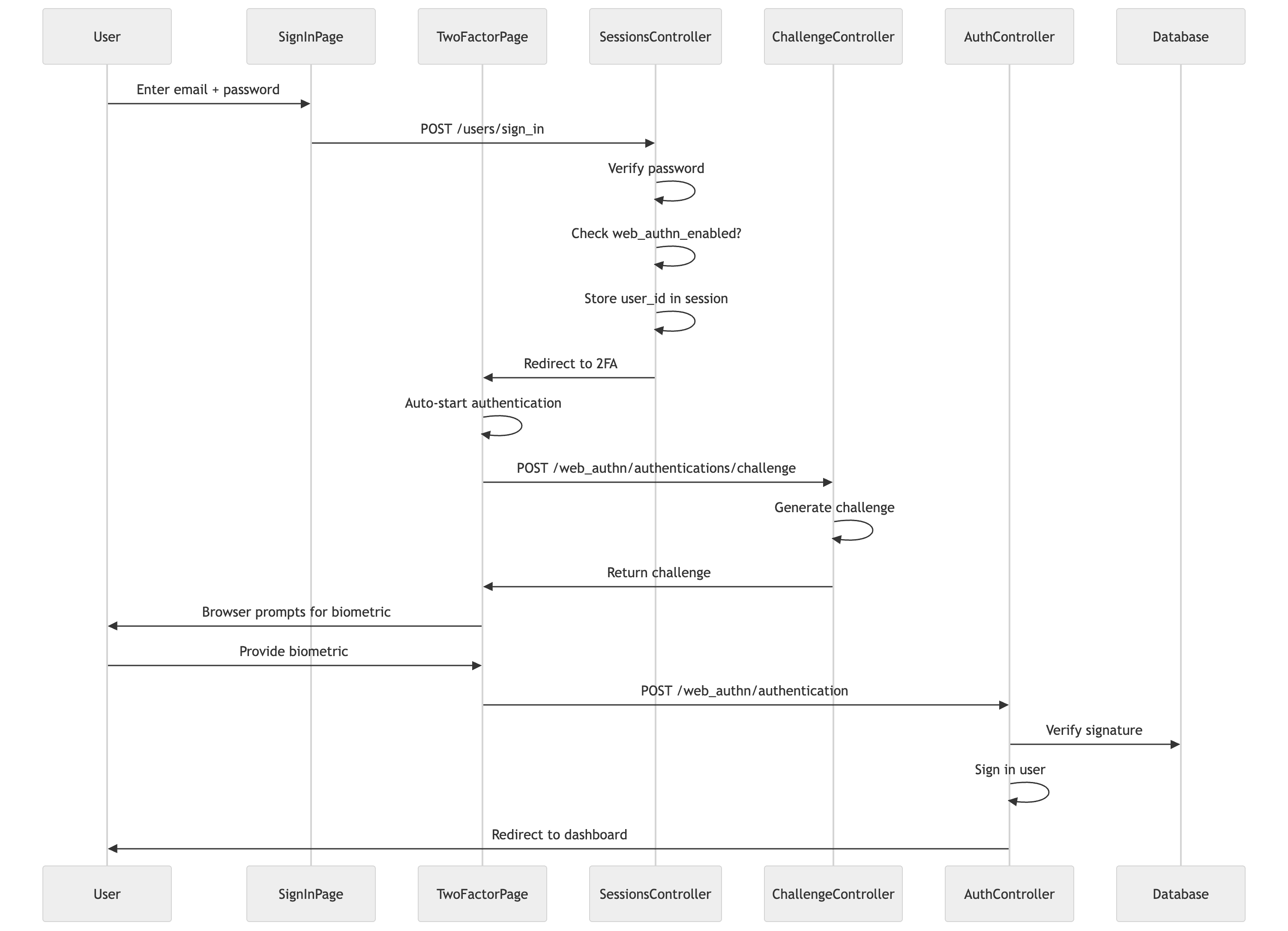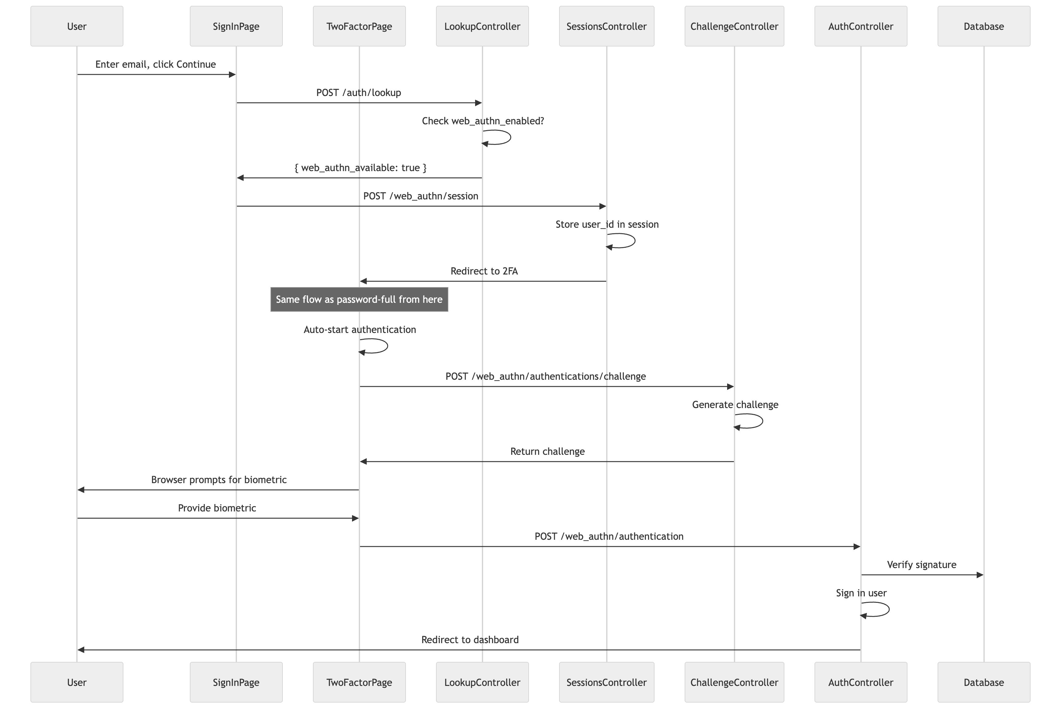 <scriptsetuplang="ts">// ... previous codeasyncfunctionauthenticate(){isAuthenticating.value = trueerror.value = nulltry{// Step 1: Get challenge from server// This is a separate request from the actual authentication// because we need the server to generate a fresh challengeconstchallengeResponse = awaitfetch(web_authn_authentications_challenge_path(),{method:'POST',headers:{'Content-Type':'application/json','X-CSRF-Token':getCsrfToken()}})if(!challengeResponse.ok){constdata = awaitchallengeResponse.json()thrownewError(data.error || 'Failed to get authentication challenge')}constoptionsJSON = awaitchallengeResponse.json()// Step 2: Start browser authentication// This triggers the browser's native passkey UI// The user will see a prompt to use Touch ID, Face ID, etc.constauthResponse = awaitstartAuthentication({optionsJSON})// Step 3: Send to server for verification// We use Inertia here so we get proper redirects on successrouter.post(web_authn_authentication_path(),{credential:JSON.parse(JSON.stringify(authResponse))})}catch(err){// Handle browser-level errorsif(errinstanceofError){if(err.name === 'NotAllowedError'){// User cancelled the prompt or it timed outerror.value = 'Authentication was cancelled or timed out.'}else{error.value = err.message}}else{error.value = 'An unexpected error occurred.'}isAuthenticating.value = false}}// Allow user to go back to sign-in page// This is important - they might realize they're on the wrong accountfunctiongoBack(){router.visit(new_user_session_path())}</script>