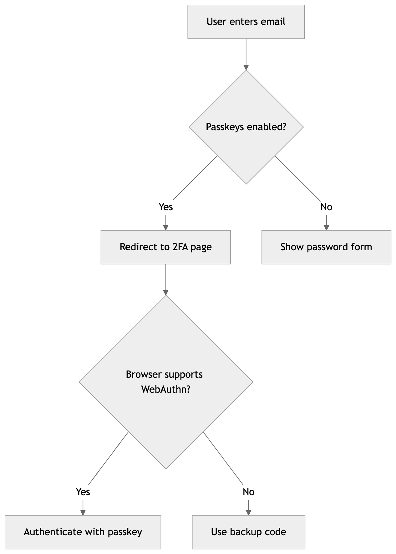 With password-less working, we can simplify. Users with passkeys now go directly to passkey authentication - they never enter a password. The password-full 2FA flow from earlier in this post is no longer needed.