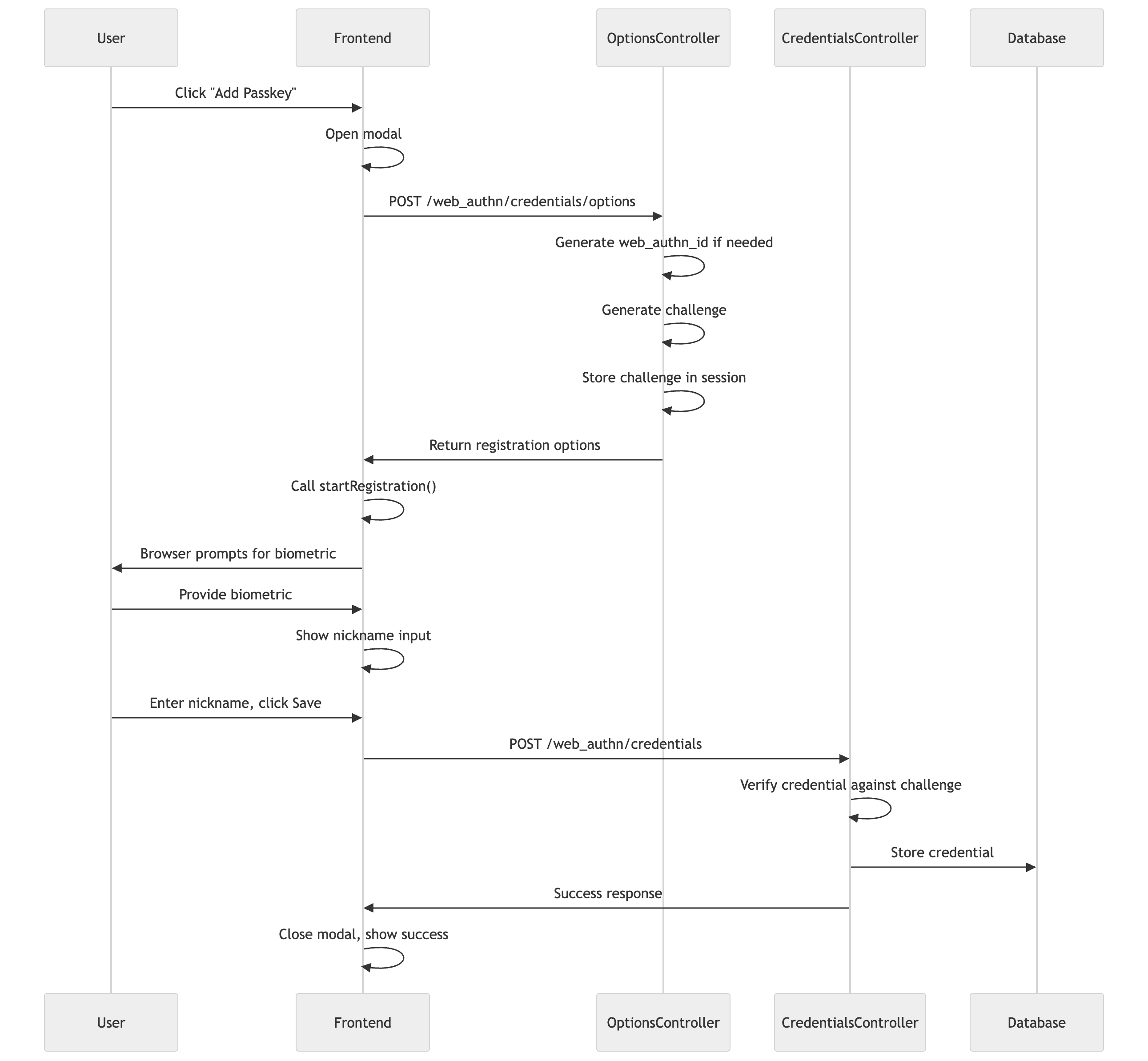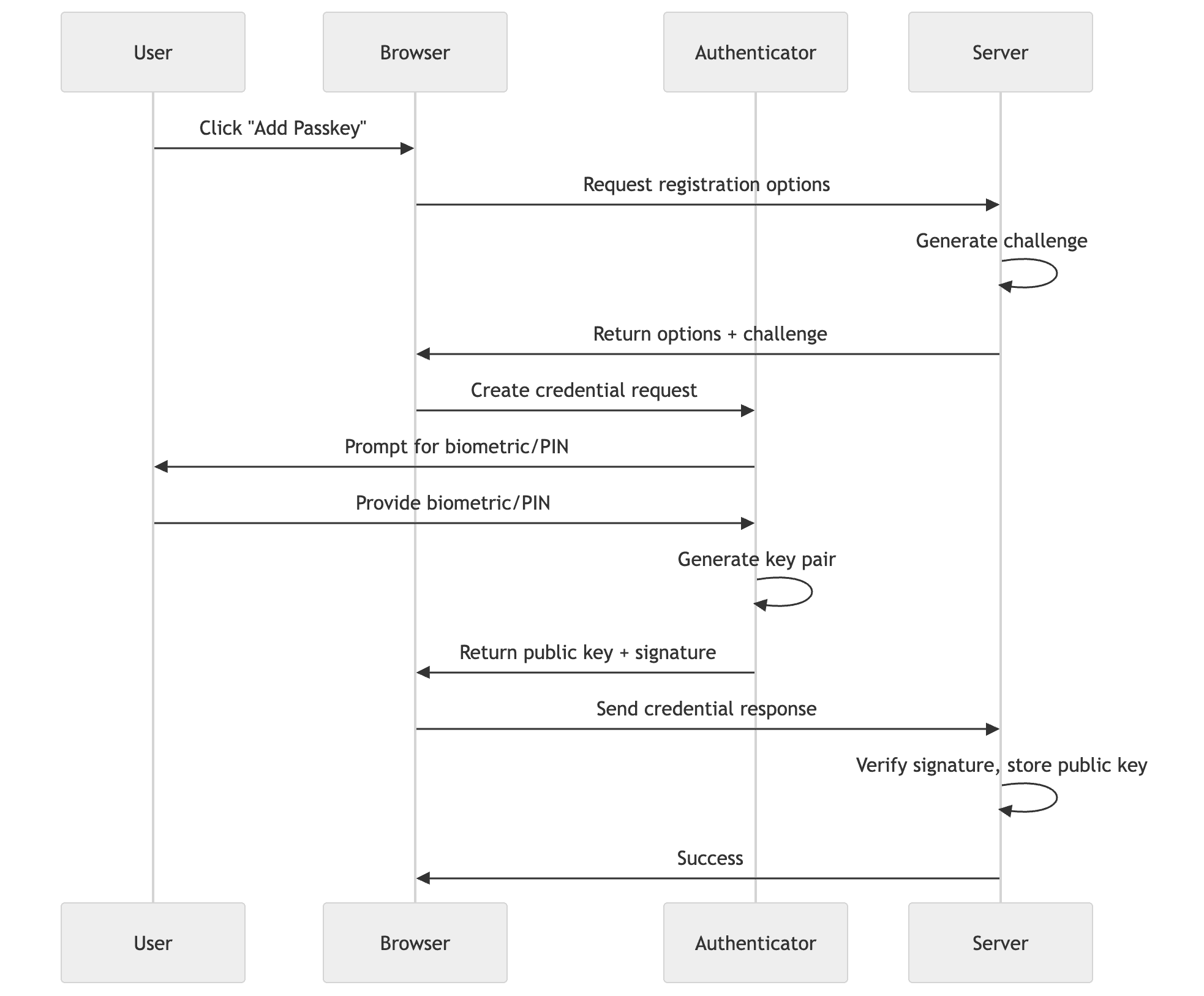 When a user wants to add a passkey, your server generates a random challenge. The authenticator creates a new key pair, signs the challenge and origin with the private key, and sends back the public key and signed data. Your server verifies the signature and challenge, then stores the public key
