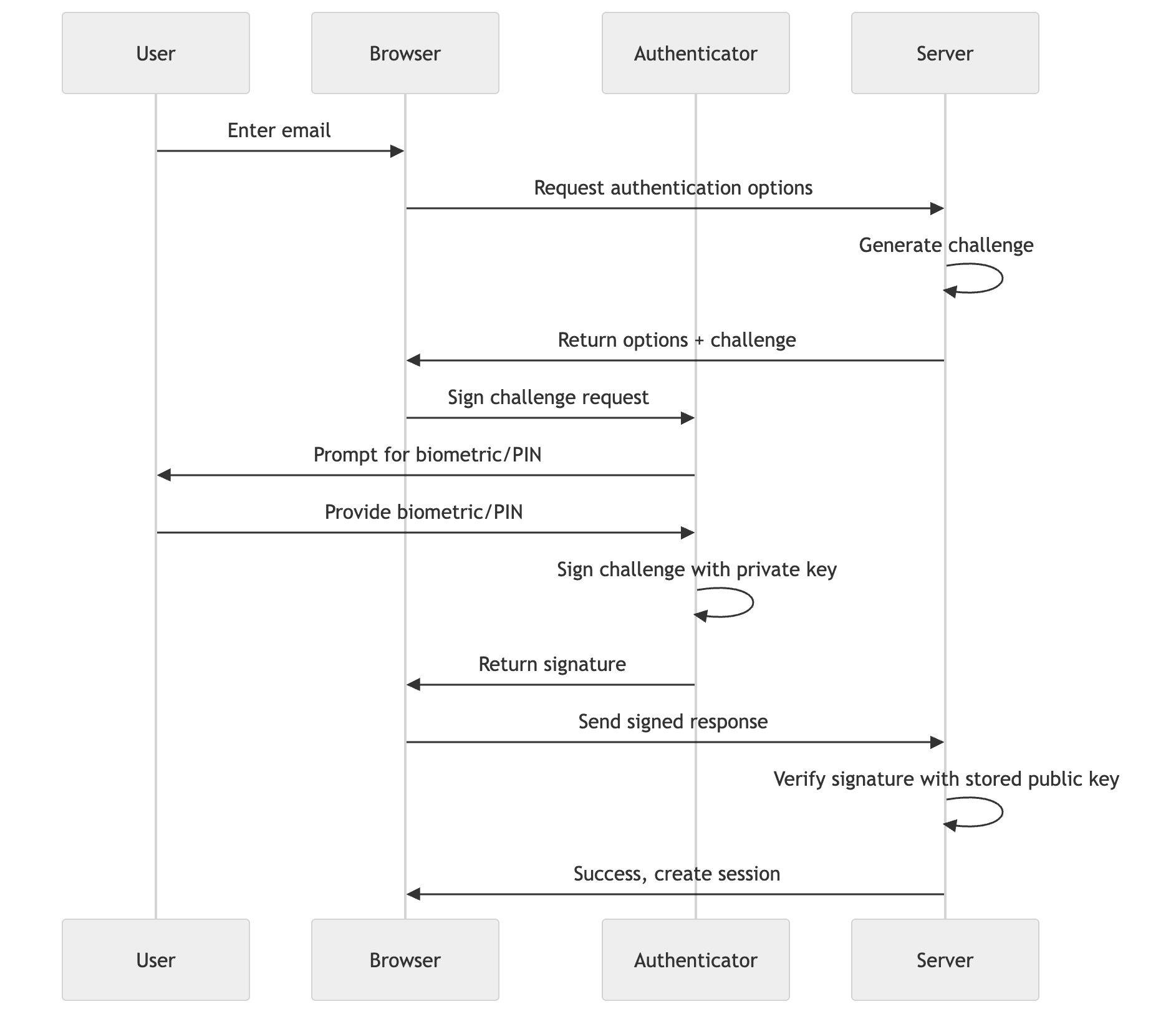 When a user signs in, your server generates a new challenge. The authenticator signs this challenge and origin with the private key it created during registration. Your server verifies the signature using the stored public key and checks that the challenge matches.